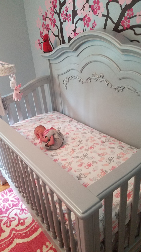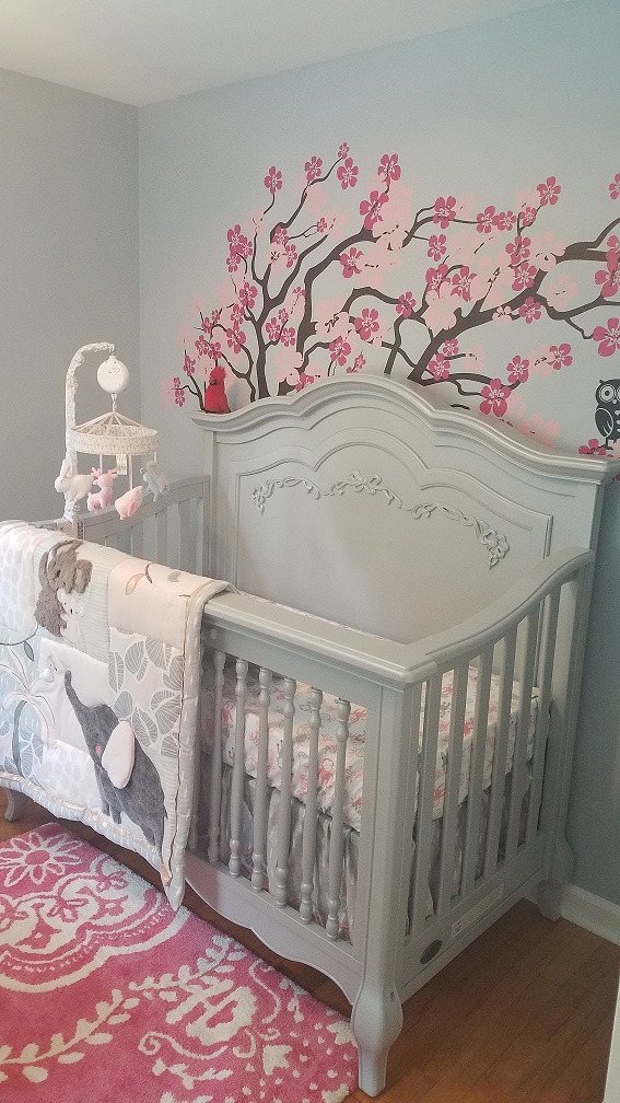 I wanted to keep the color scheme gender neutral. Since the house we moved into has two bedrooms besides ours, one next to the master and one down the hall, I figured if we have any more children in the future I may want to use the closer bedroom to us as a nursery as well, and our next child might very well be a boy! I did not want to go with yellow walls so I could decorate the rest of the room with pink or “girlie” decorations and decor. I went with pastel very light gray with a tint of blue/purple on the walls. I knew I would want the accent colors, wall decor, blankets, carpet etc. to be pink now but still wanted the ability to change it in the future.