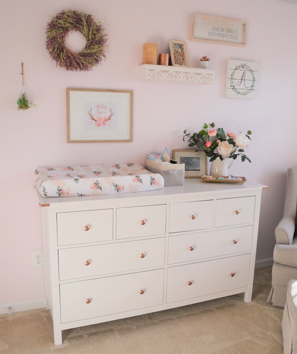 I had a lot of fun browsing Hobby Lobby for the wall décor and knew I wanted to add dimension and texture to the wall above the changing table. Most of the pieces over the dresser are Hobby Lobby.