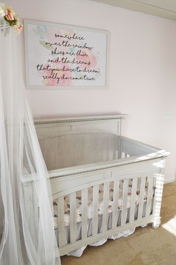 I saw a sign somewhere else with these “Somewhere Over the Rainbow” lyrics and instantly knew I wanted that saying on there. What a beautiful sentiment to have hanging over our daughter’s bed, “dreams really do come true”. The style and size weren’t right though. So I decided to create a custom piece (now also offered in our online home décor shop www.tallpinewoodworks.com ) and it fits perfectly! The watercolor peonies in the background are great too.