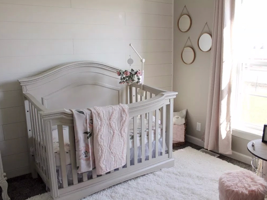 Accent walls add a great focal point in the room. The shiplap accent wall in the nursery gives the room a warm vibe. The shiplap has been painted to complement the trim color, making it a lovely backdrop for the crib.