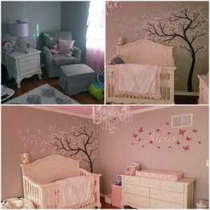 The wall against which the crib is set is decorated with a tree decal. One adjacent wall stations the double dresser with a changing pad. Opposite to this is the armoire set between two tall windows that provide daytime lighting. Opposite the crib is a glider – set against the corner and by the window. The nightstand is placed conveniently on the right.