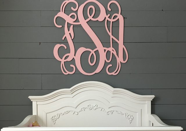 The crib itself is placed against a shiplap wall with a monogram in pink. It sits just across a tall, pink-curtained window. The rocker sits conveniently next to the crib on the left. Against the adjacent wall, next to the crib and on the right is the double dresser with a changing pad. The floor is covered in a wall-to-wall, vintage grey carpet that adds the right amount of relief and bolsters the play of ivories and pink elsewhere in the room.