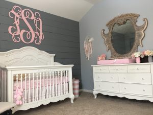 The crib itself is placed against a shiplap wall with a monogram in pink. It sits just across a tall, pink-curtained window. The rocker sits conveniently next to the crib on the left. Against the adjacent wall, next to the crib and on the right is the double dresser with a changing pad. The floor is covered in a wall-to-wall, vintage grey carpet that adds the right amount of relief and bolsters the play of ivories and pink elsewhere in the room.