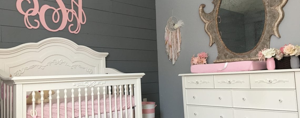 The inspiration for the nursery came from a lot of Pinterest. We decided we wanted to have her back wall shiplap. I knew the colors were going to be gray, pink, and ivory. I never really wanted a theme for the room. I envisioned having multiple things come together to create this classic, shabby-chic room.