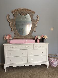 My favorite part of the nursery is the dresser and mirror combo. I just love how that came together. It completely changed the aspect of the room. There is the blanket hanging on the rocker. I had a teacher intern this last year. His wife had made that blanket for Faye. It is absolutely beautiful and I know it’ll stay with her.