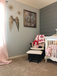 The inspiration for the nursery came from a lot of Pinterest. We decided we wanted to have her back wall shiplap. I knew the colors were going to be gray, pink, and ivory. I never really wanted a theme for the room. I envisioned having multiple things come together to create this classic, shabby-chic room.