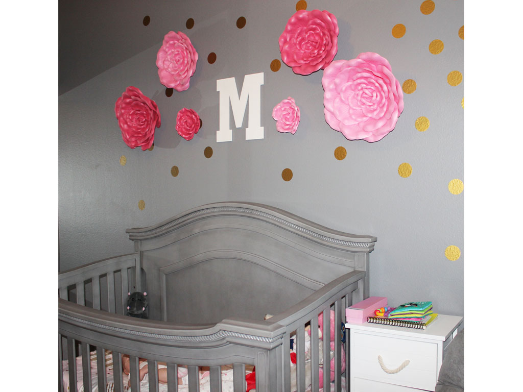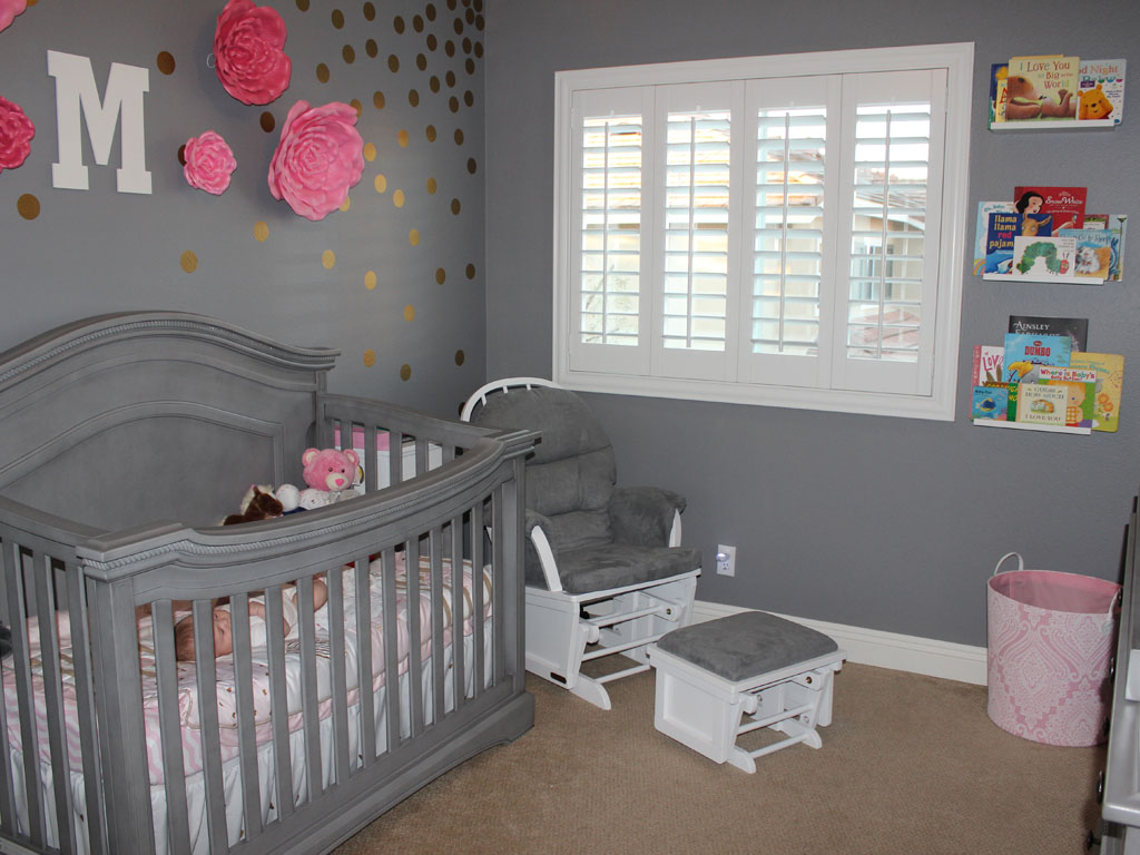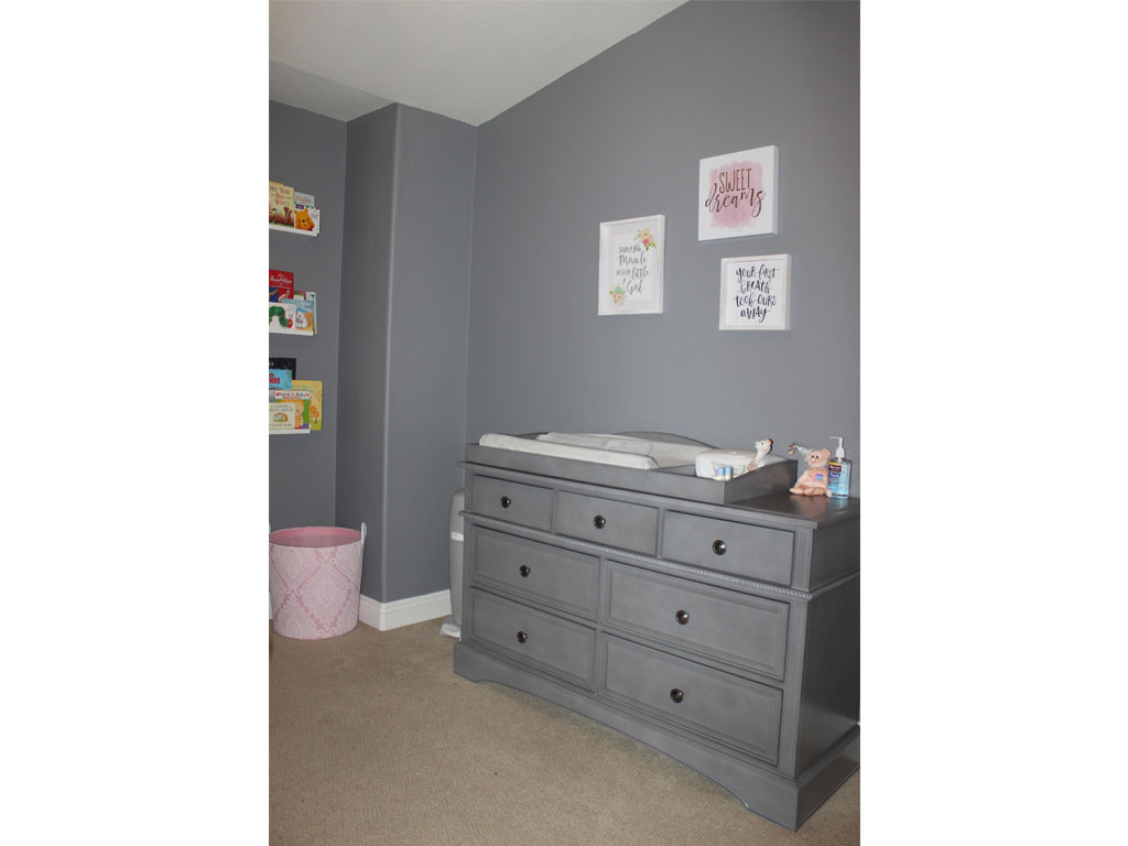 My husband and I knew we really wanted to have a neutral tone to the room. Grey was our starter color before we found out the gender. That way we could go either way- pink or blue. I wanted to add pops of pink and gold among the grey wall and furniture to make it really pop. I also love how the grey can transition when she grows older and can be added with any other accent colors she likes when she grows up.