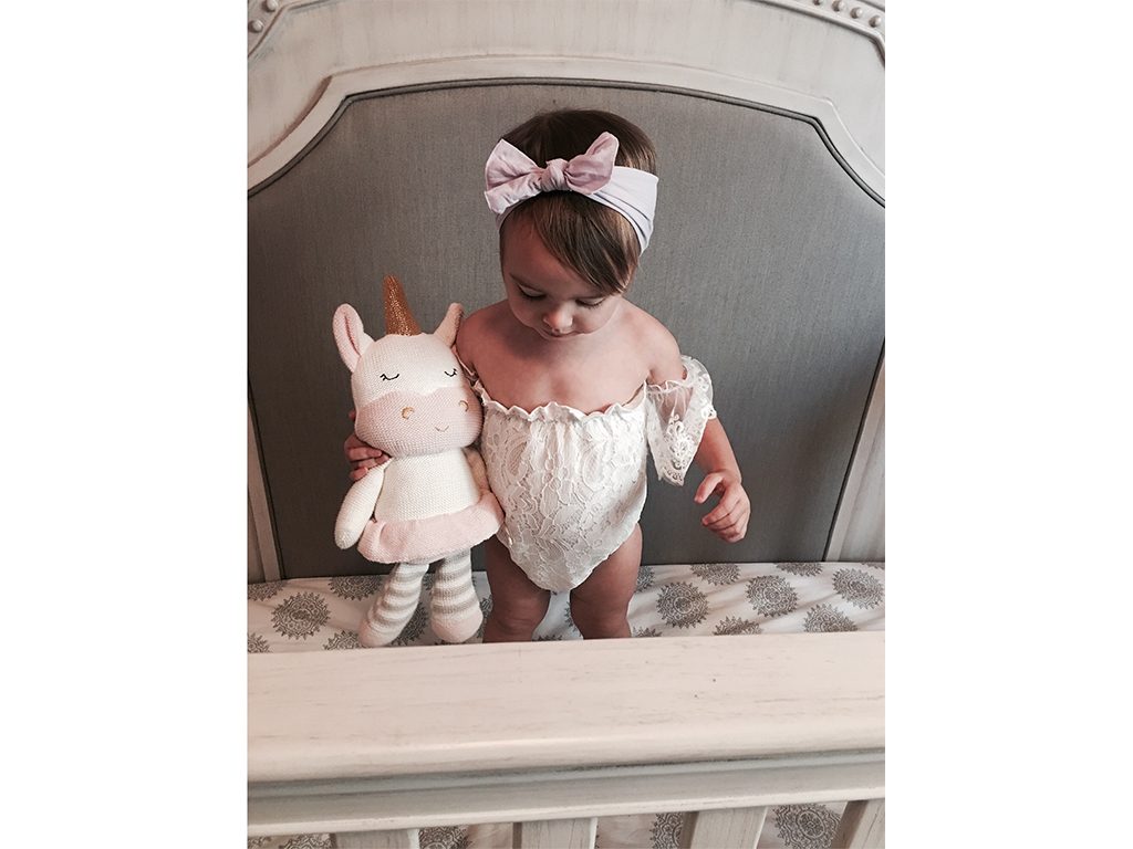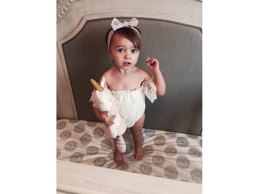 As soon as I saw the Julienne crib, I was in love. There was no turning back at that point. The craftsmanship and beautiful details were incomparable to any other brand. The antique mist finish flows perfectly with her floral and feathers theme and compliments her wood wall nicely.