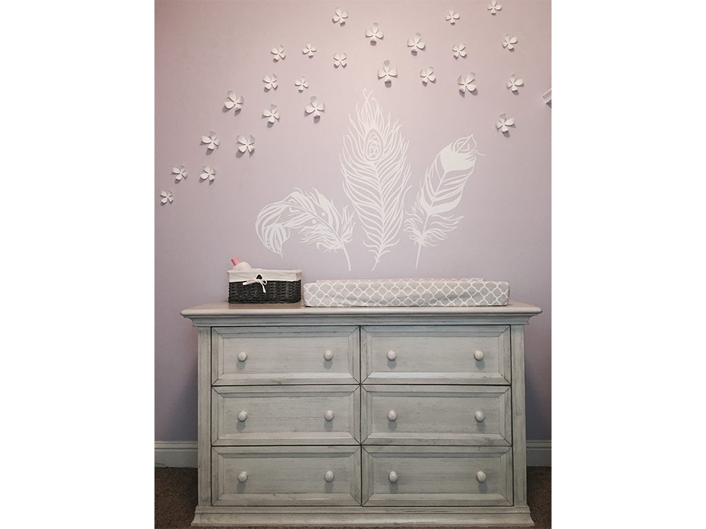 We love a mom who boldly mixes and matches pieces from different nursery collections. Ashley picked a double dresser from the Evolur Napoli Nursery Collection and placed it on the wall adjacent to the crib. Owing to the limited space, Ashley kept decor accents to a minimum giving the nursery a bright and spacious feel. Pretty white flowers and a feathers decal on the wall above the Napoli Double Dresser adds a whimsical, wind-blowing-through-a-meadow feel.