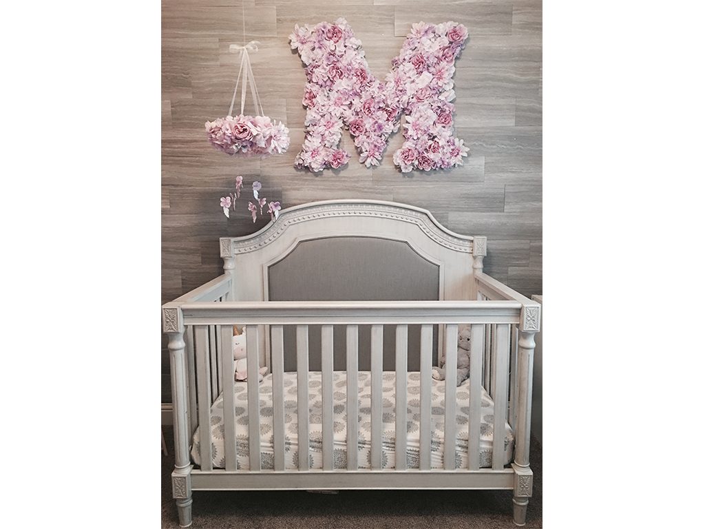 Open your eyes for this is exactly what baby Mia’s shabby chic nursery feels like. A beautiful spring day filled with sweet, tender moments. Mom Ashley Sagastume’s shabby chic nursery, featuring the Evolur Julienne 5-in-1 Convertible Crib for her baby girl Mia Marie, is soft, feminine and filled with love. And what a pairing. The Evolur Julienne 5-in-1 Convertible Crib and a shabby chic nursery decor are a match made in heaven. Ashley kept the color scheme simple with grays and delicate purples and pinks. The Julienne crib is placed against a faux wooden wall that lends the room a comfortable warmth. A beautiful floral M initial placed on the wooden wall gives the room a fresh, garden feel. An equally sweet floral crib mobile, placed over the Julienne crib, adds to the allure.
