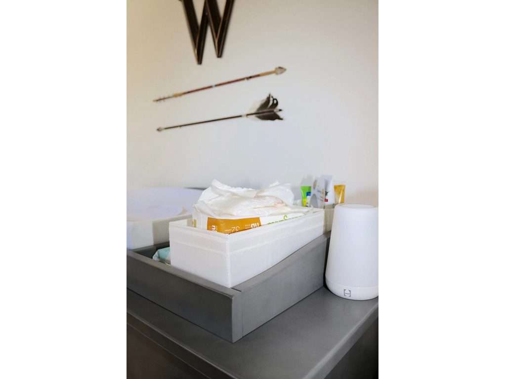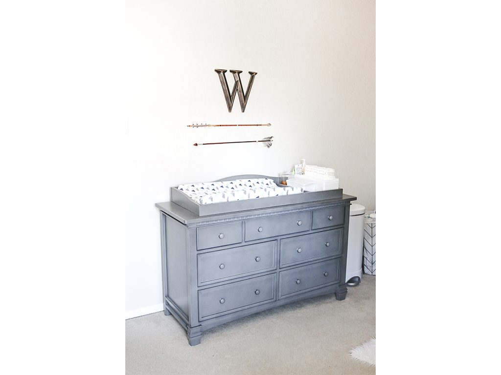 Wyatt’s baby boy nursery is decorated on the lines of a wilderness theme. A moose wall hook, a couple of arrows and a bear head as wall decor and an animal print crib sheet give the nursery a wilderness vibe, softly and in an understated fashion. Erin picked the Evolur Santa Fe 5-in-1 Convertible Crib and Double Dresser in Storm Grey for Wyatt’s nursery. With its subtle dentil moulding and classic lines, the Santa Fe Nursery Collection is simply perfect for this calming and tranquil, wilderness-themed baby boy nursery. A glider, a small side table and floor lamp complete this relaxing nursery.
