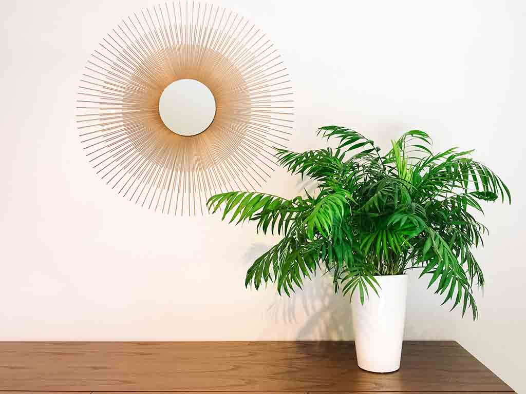Also known as Parlor Palm, this plant features a slender green trunk, narrow and long leaves forming an arched front. Furthermore, the Neanthe Bella Palm slowly grows over the years and is an ideal choice if you are inspired by a palm tree baby nursery.