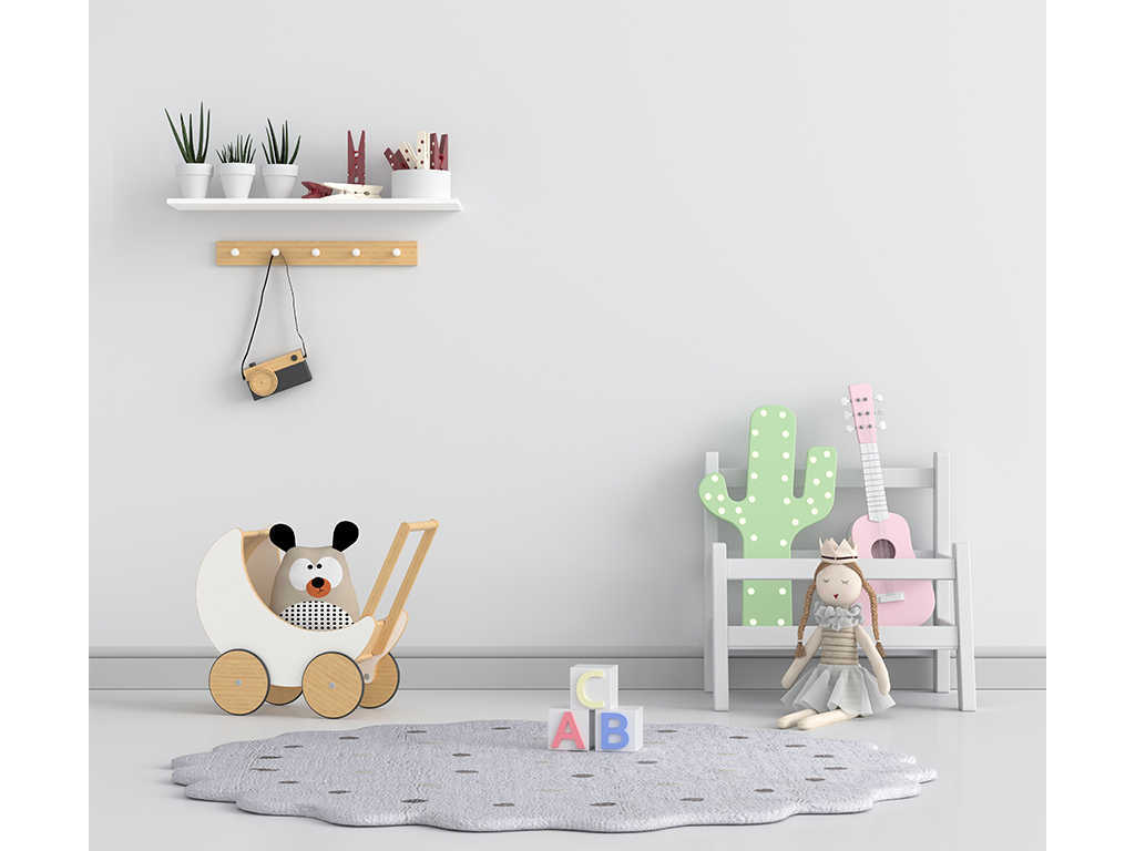 To add more signature items to your nursery, you can place a cactus-shaped ceramic flower vase on one of the wall shelves. Go for red, pink or white flowers to add the right pop of colour to the room!
