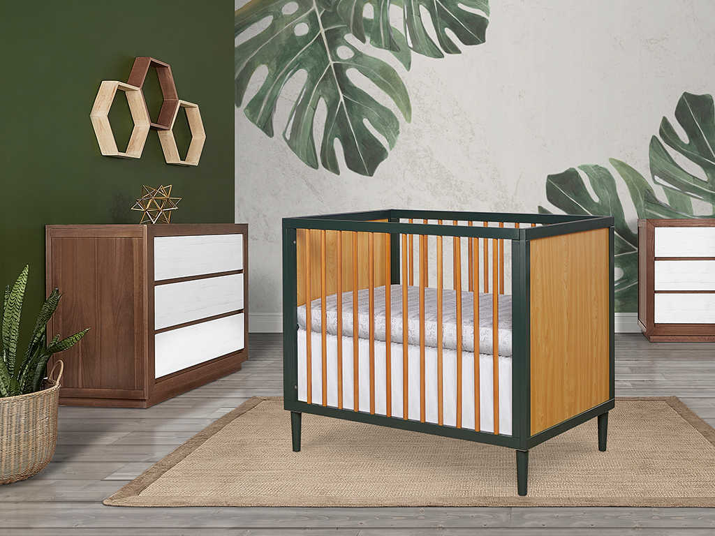 • Go for an overall white color theme with a dark green accent wall that will be beneath the crib. However, with dark green, we recommend a natural-wood baby crib or a plain white crib.
