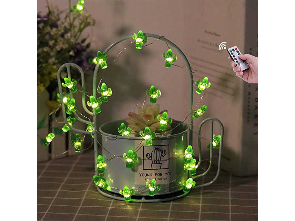 In case you are not intrigued with the idea of a cactus-shaped garland or can’t find one, you can also opt for cactus-themed LED string lights.
