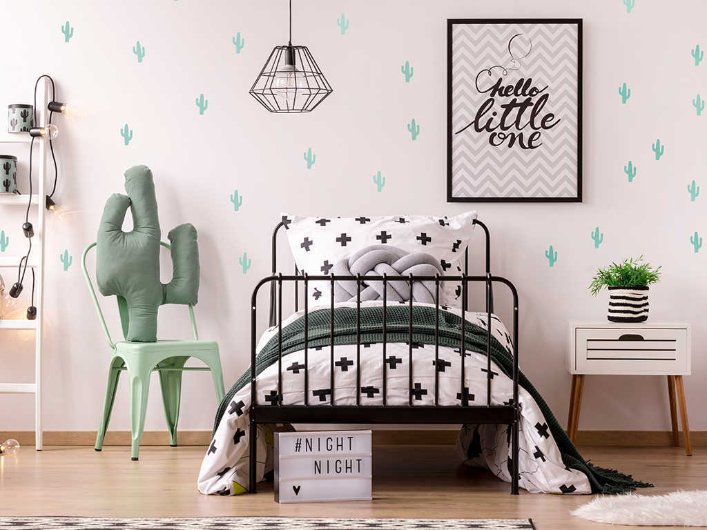 A nursery theme is incomplete until the wall behind the crib has some special accents to it. For cactus nursery ideas, the easiest one is to opt for a cactus-inspired wallpaper that adds a splash of greenery to your room without doing much. You can either go for bold large prints or keep things minimal by choosing a plain wallpaper with tiny cactuses all over or a mix of cactuses only at the bottom.