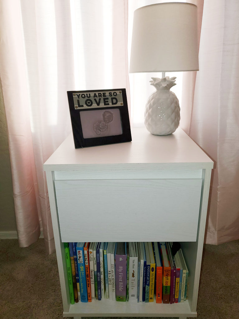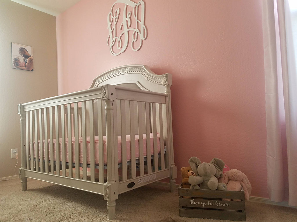 We chose lots of handmade pictures for her wall as well as other pretty accents to create a very fun look. Also, after battling years of infertility, we wanted to include reminders of how hard we worked to have our daughter. We chose the Always be brave crate that was used during my IVF cycle to store her stuffed animals in and a pineapple lamp as pineapples are a symbol of infertility. Monogram gives her room a personalized feeling. We also included a photo frame with a picture of our daughter as an embryo, hand-painted pictures with her name and positive affirmations.