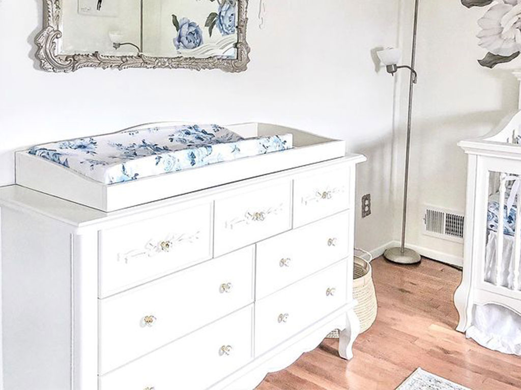 A few of my friends had Evolur furniture and had nothing but great things to say! I was also drawn to the design of the furniture and styles. The reason why I picked the Aurora collection is the way it made me feel when I looked at it. I automatically saw a little baby girl sleeping in her crib and eventually playing in her room. I got the set that turns into a full-size bed because I would love for the furniture to grow with her. But what really drew me to picking the Evolur brand is the girly, feminine design of the table. The Lacey bow sealed the deal.