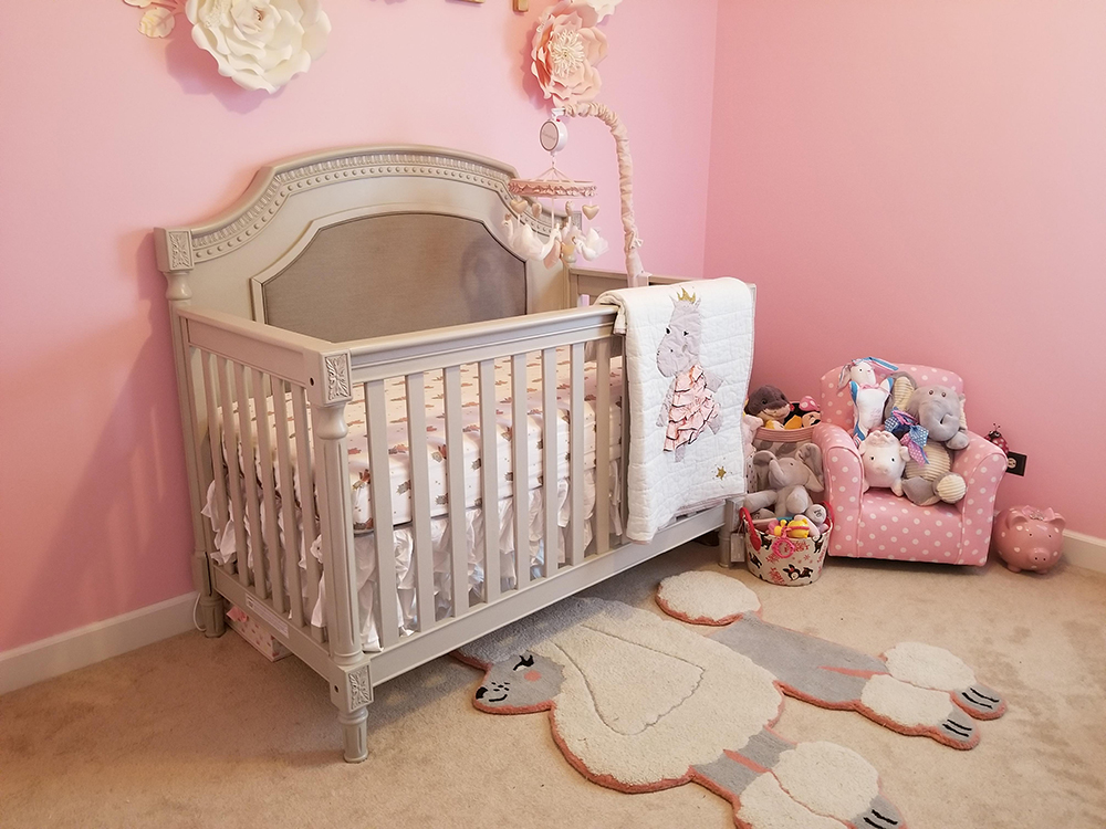The crib, an évolur Julienne in Antique Mist finish rests against the left-hand-side wall. The wall above the head-boards is festooned with, what has now become ubiquitous, paper flowers from Etsy with Lily’s name in florals. A pink baby mobile hangs over the crib’s animal-print mattress and hippo-appliquéd quilt based on ivory white. Next to the crib, in the corner, are printed baskets with a veritable zoo of super-cute, super-cuddly stuffed animals and a pink, white-polka-dotted baby sized couch. Now, what more could a teensy little baby girl want?