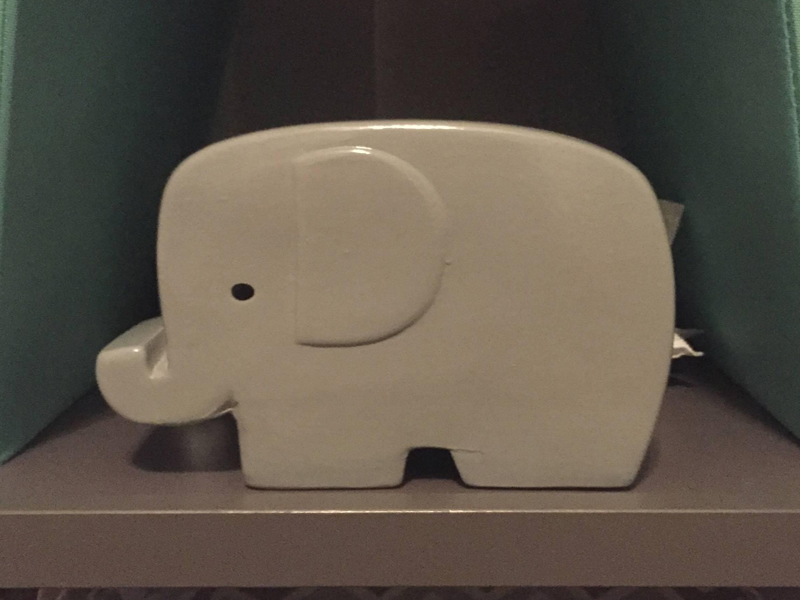 Every quilt you see was made by a friend. There are photos of elephants that a friend took on a safari. The mobile on the crib was another gift, as is the pillowcase of the elephant shooting a rainbow out of his trunk. The teal piece of wood with an elephant on it was made by another friend of ours. Many of the other little trinkets were items of mine from my childhood that I wanted to incorporate. There is a brown elephant sent to me by a friend who has helped walk this journey with me and provided much support. I need to paint it before the baby comes, but just haven’t had time yet. We have a tiny clock on one of the walls that was in the room I used to sleep in when visiting my grandparents. My grandmother would wind it up each night before bed, and I have fond memories of it. I love that I will be able to do that for my son one day.