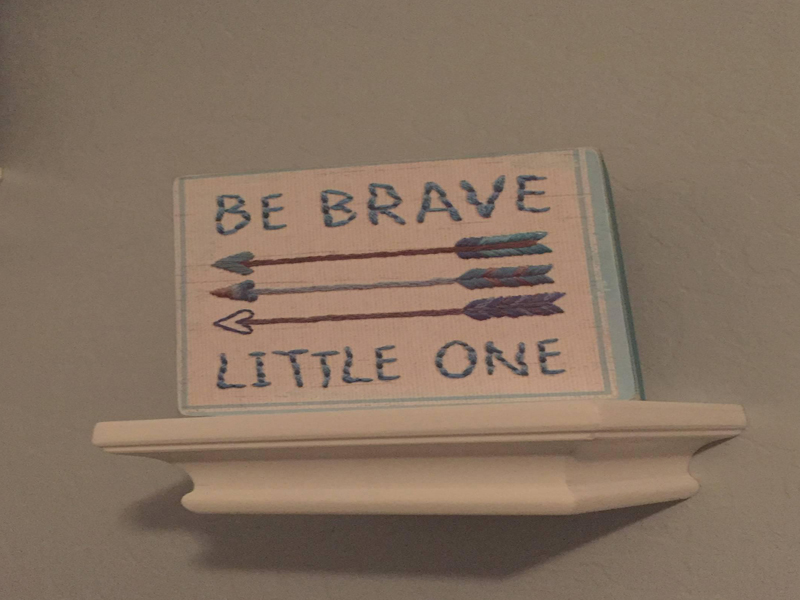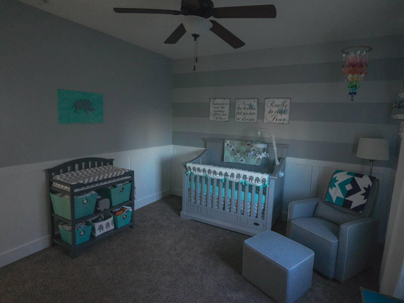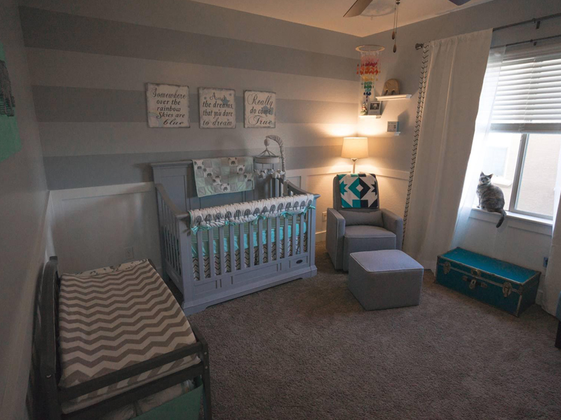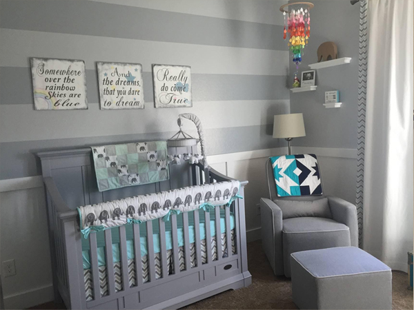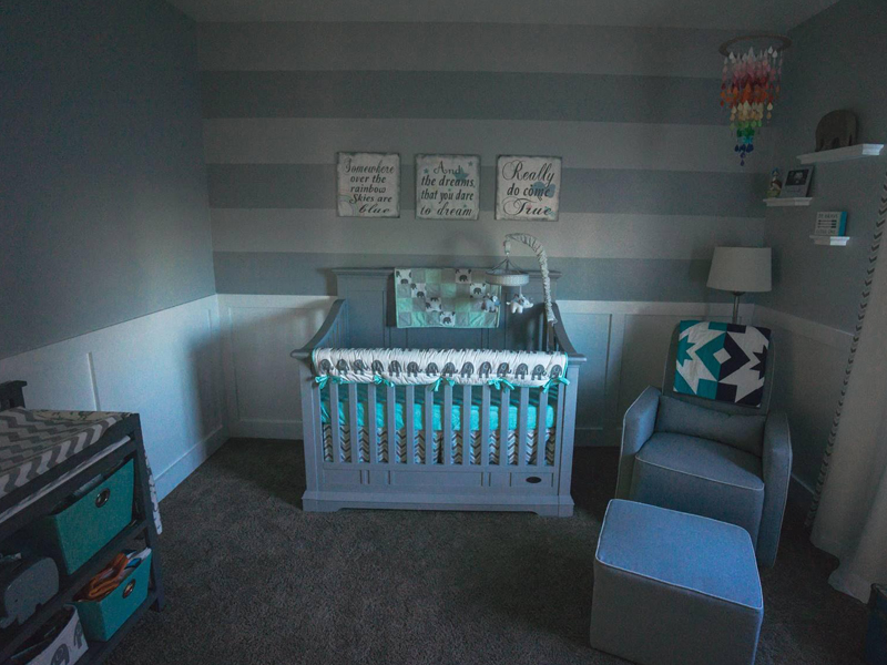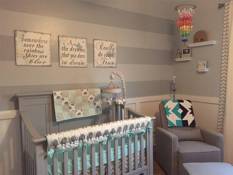 As I mentioned in the earlier question, the teal and grey was kind of something that just kind of happened. I didn’t have a theme in mind for this baby, but did have one in mind for our first. I think people knew that I was not able to make my original dream nursery happen, so they began sending items that were reminiscent of what I originally dreamed of. Eventually, we received enough gifts in this theme that we decided to go with it for this baby. We wanted to incorporate everything we had received, and mostly everything is centered around elephants and teal and grey colors. Rainbows were important to me, since this is our rainbow baby and I love bright, vibrant colors. I wanted to be tasteful about it and not make it too tacky. I feel really happy with how everything flows. They were two very random themes, but I love the pop of the color from the rainbow mobile and the rainbow quilt. The message above the crib is one that I feel honors our entire journey, as our dreams are coming true. We hope the message is something that will follow throughout our baby’s life, so we hung it above where he will sleep.